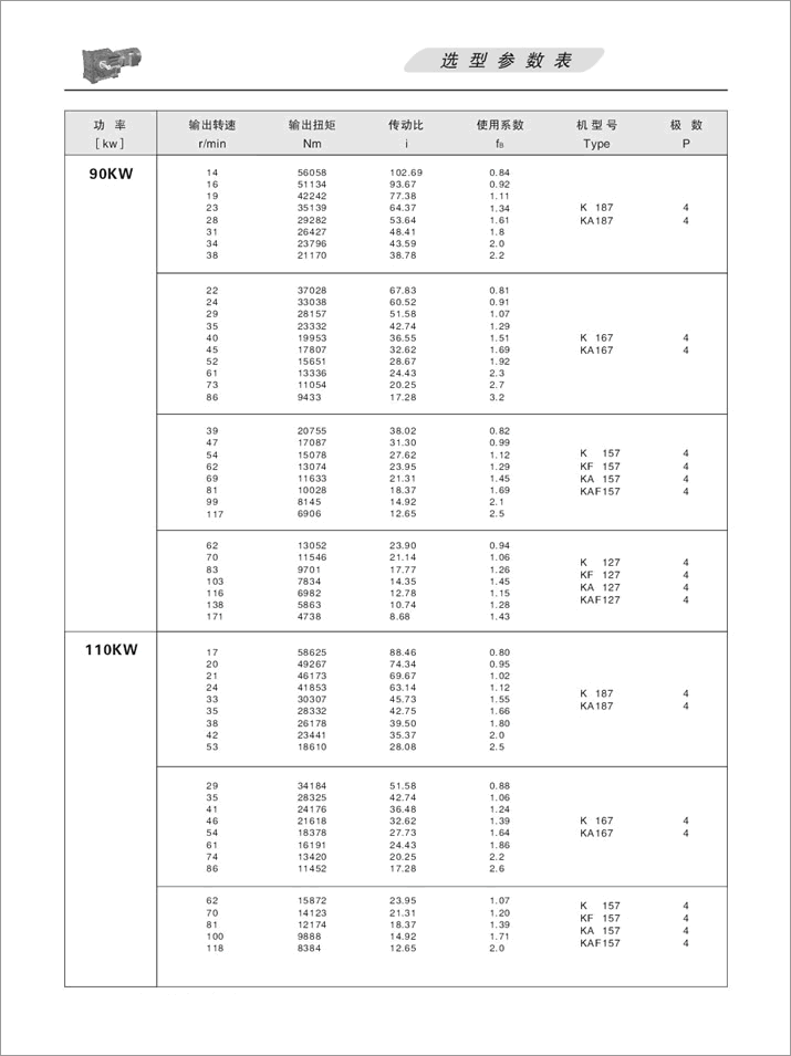 K螺旋錐齒輪減速機選項參數(shù)表90KW、110KW、132KW、160KW、200KW