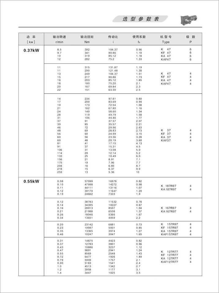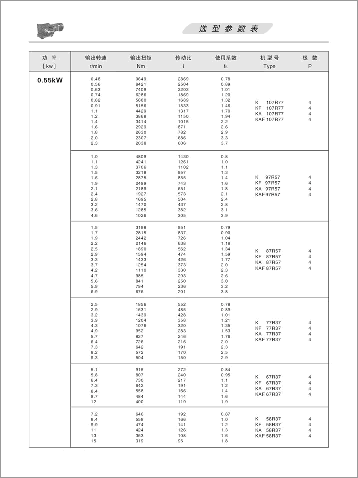 K螺旋錐齒輪減速機選項參數表0.55kW