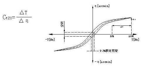 扭轉(zhuǎn)剛度Ct21[Nm/Arcmin]:由加載力矩和所產(chǎn)生的扭轉(zhuǎn)角之間的比率來定義。Ct21=△T/△ψ。它說明需要用多大的力矩才能把輸出軸轉(zhuǎn)動一弧分。扭轉(zhuǎn)剛度是從遲滯曲線得出的。在曲線圖上只需要關(guān)注T2B的50%和100%這個范圍,在這個范圍內(nèi),曲線可看成是一條直線。