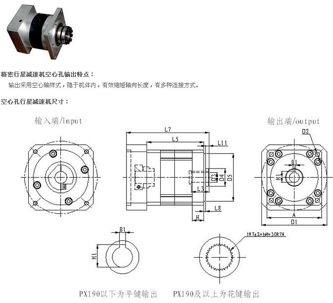 說明:空心孔輸出時(shí),與減速機(jī)D3配合的軸徑將與原標(biāo)準(zhǔn)減速機(jī)軸徑要小,幫扭矩可根據(jù)與D3配合軸徑來計(jì)算,其余參數(shù)均可參照PX標(biāo)準(zhǔn)系列。